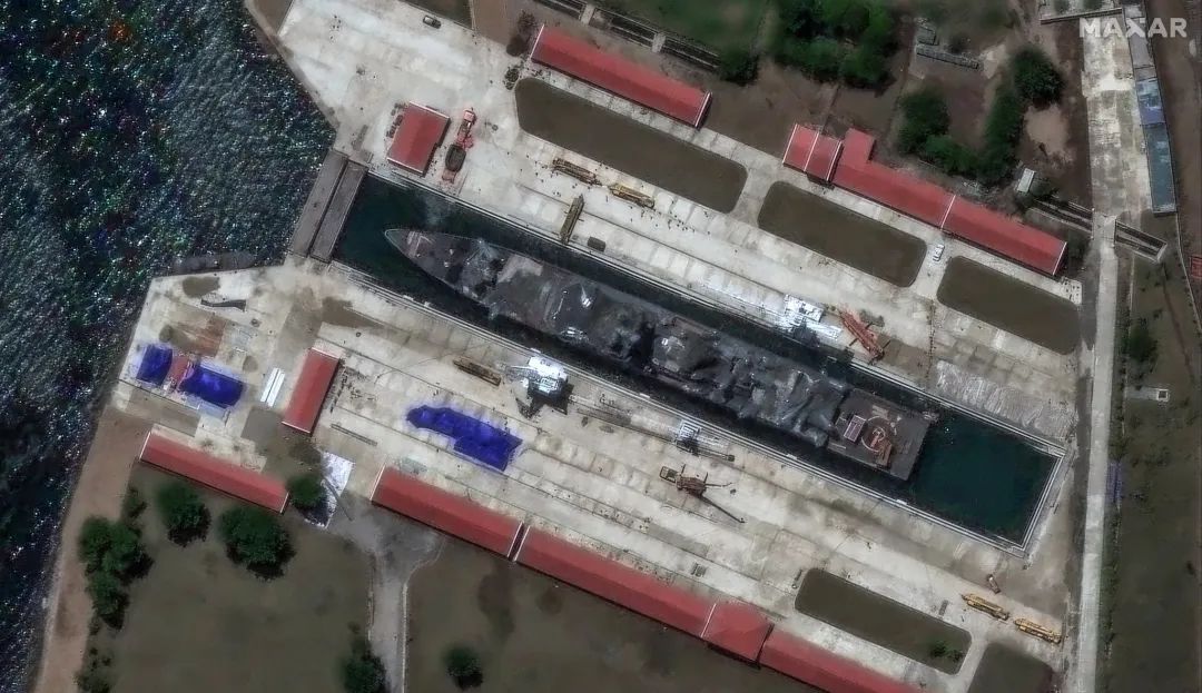 在事故发生19天以后,朝鲜驱逐舰终于被转移到船坞进行维修。根据最新MAXER卫星图像显示,5月21日下水时侧翻的朝鲜“崔贤”级驱逐舰2号舰,已经于6月8日从清津造船厂转移到了罗津造船厂干船坞,进行接下来的修复。