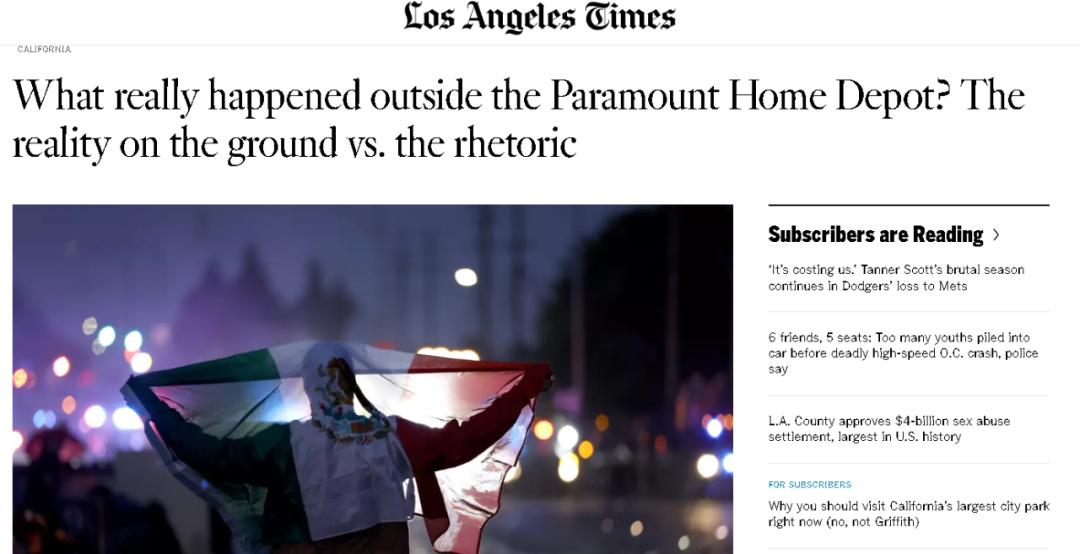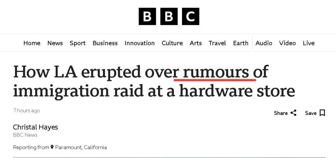 不过,尽管BBC认为这起如今已经演变成大规模骚乱的事件,是由网络“谣言”引发。但美国媒体却给出了不同的说法。比如洛杉矶本地的《洛杉矶时报》就提到了重要的细节,称在上周六ICE人员与当地抗议者发生对峙前,ICE人员其实已经在洛杉矶多地逮捕了超过40名移民,包括从一处服装仓库带走了多人,以及当着一个8岁孩子的面抓走了他的父亲。这些行为都引起了不同规模的街头抗议。换言之,上周六ICE人员和洛杉矶居民在派拉蒙爆发的对峙,并不只是BBC所说的网络谣言那么简单,这背后是双方一系列矛盾和情绪不断叠加的结果。