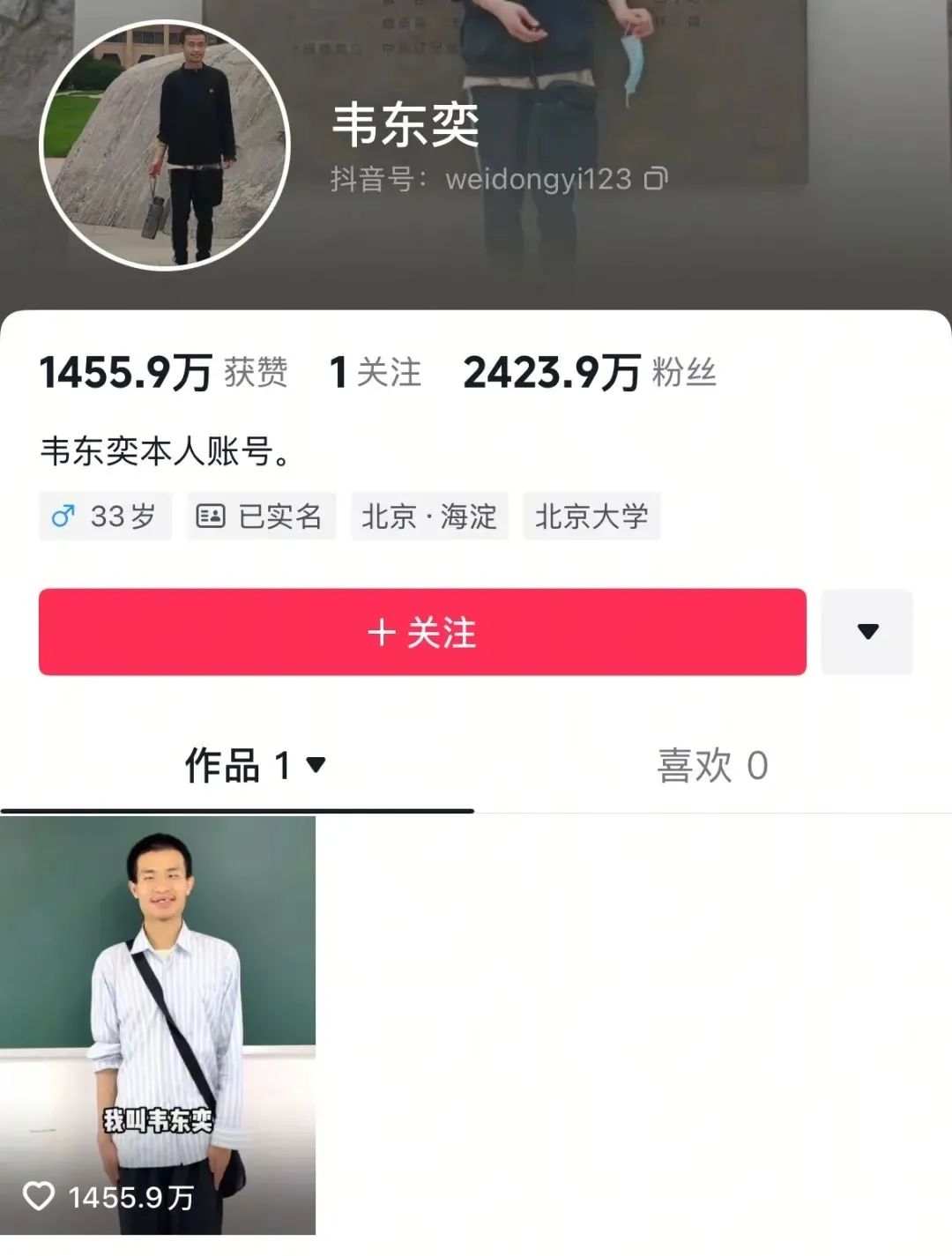 且在介绍中标注为“韦东奕本人账号”