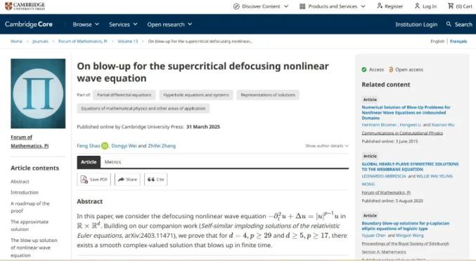 据澎湃新闻报道,在舆论喧嚣之外,其实专注学术的韦东奕近日与其他两位学者章志飞、邵锋合作在数学界顶级期刊《Forum of Mathematics, Pi(数学论坛,π) 》以“On blow-up for the supercritical defocusing nonlinear wave equation(超临界散焦非线性波动方程的爆破现象研究)”为题发文。该研究考虑在R×Rd上的散焦非线性波动方程-∂t⊃2;u+ Δu=|u|p−1u;基于团队之前的配套工作(相对论欧拉方程的自相似内爆解,arXiv:2403.11471),该研究证明了对于d=4且p≥29,以及d≥5且p≥17的情况,存在一个在有限时间内爆破的光滑复值解。