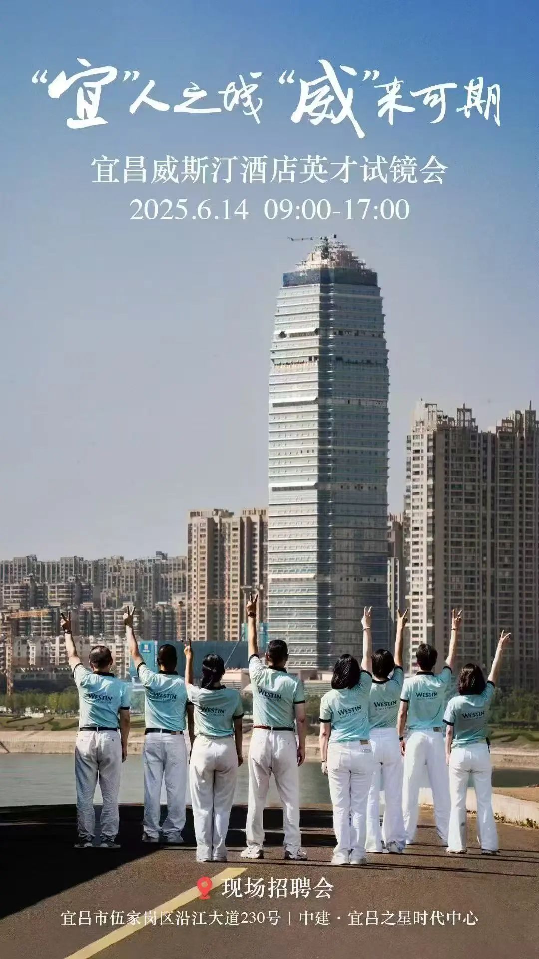 我们将在6月14日(在此地举办我们的“宜”人之城,“威”来可期”的英才试镜大型招聘会,在这里我也诚挚的欢迎所有立志于酒店行业,喜爱威斯汀品牌的各类人才加入到我们的万豪大家庭中,不但可以获得良好的薪酬福利,更多的培训机会和晋升通道,还可以了解高端的万豪品牌,获得丰富的业主资源。我们可以一起为“宜昌威斯汀酒店”的美丽绽放而共同努力!