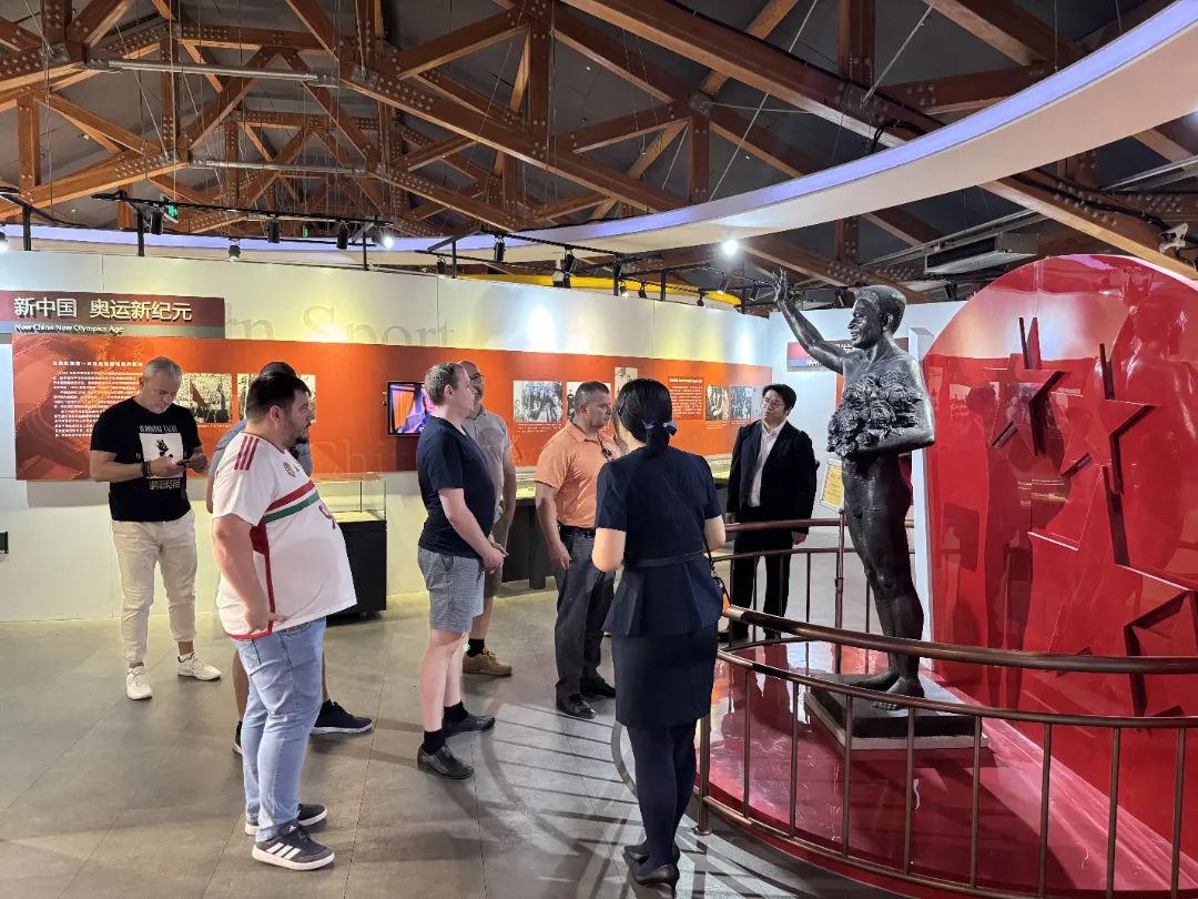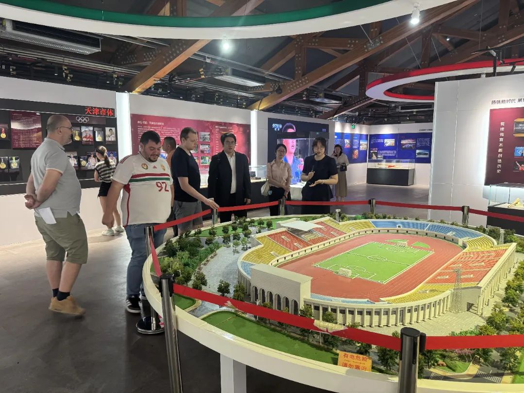 随后,代表团一行来到天津体育博物馆,在讲解员的引导下,代表团依次参观了“天津与奥运”专题展、海河回响—女排精神展和“体育非遗看天津”展览。匈牙利朋友们对张伯苓先生“强国必先强种,强种必先强身”的体育精神深表赞同。“中国蛙王”穆祥雄在布达佩斯勇夺冠军的传奇往事,以及匈牙利国脚卡达尔在天津津门虎足球队担任队长的故事,更让他们倍感亲切,进一步拉近了两国体育文化的距离。5月31日上午,代表团一行现场观摩了2025天津海河国际龙舟赛,感受中国传统体育运动的独特魅力。匈牙利客人对龙舟赛展现出浓厚兴趣,双方围绕赛事组织、人才培养、技术交流等方面展开深入探讨,希望未来在赛艇及相关水上运动领域开展深度合作,以体育为桥梁,推动两国文化交流再上新台阶。
