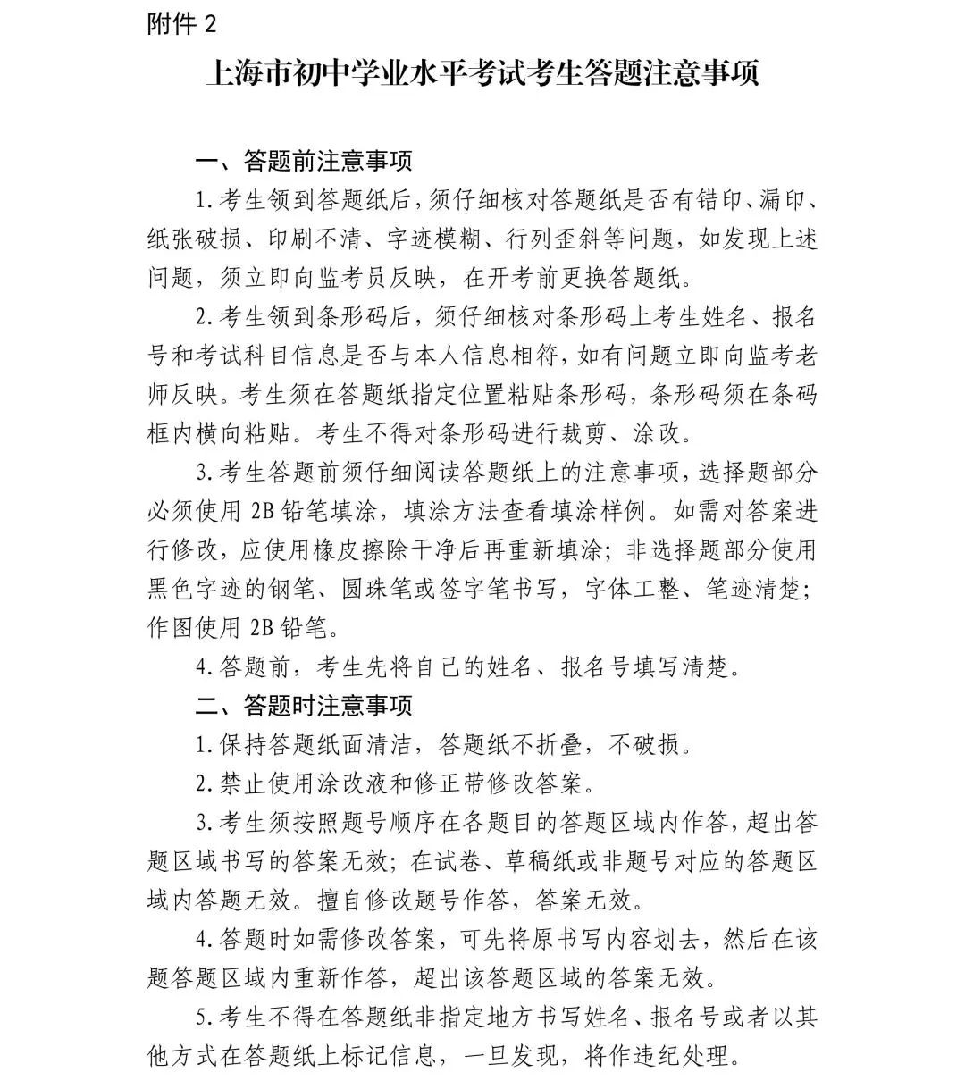 5.诚信参加考试。请考生仔细阅读《上海市初中学业水平考试笔试科目考试考场规则》(附件1)《上海市初中学业水平考试考生答题注意事项》(附件2)和《上海市初中学业水平考试外语听力注意事项》(附件3),严格按照考场规则参加考试。考试期间若有违规、违法行为,将参照《国家教育考试违规处理办法》(教育部令第33号)和《中华人民共和国刑法修正案(九)》严肃处理。