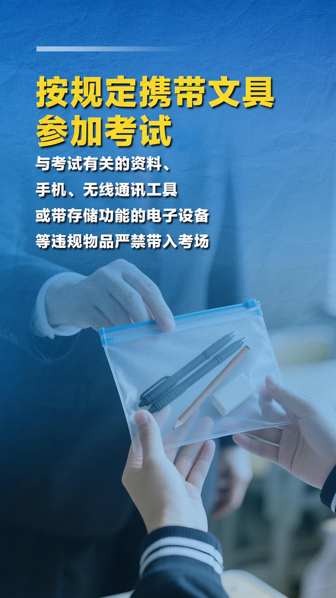 1.配合安全检查。本次考试实行考点和考场“二次安检”,为方便考生快速通过安全检查,请考生事先准备透明文具袋、透明资料袋,携带考试必需的文具等考试用品。严禁携带手机、智能手表、智能手环、智能眼镜、蓝牙耳机等具有发送和接收信息功能的工具,以及电子计时器、有数字显示屏的手表、计算器、涂改液、修正带、翻译笔等物品。建议将手机等上述物品放于家中或交由送考教师或家长保管。开考后若发现考生携带手机等具有发送或者接收信息功能的设备入场,将按考试作弊处理。