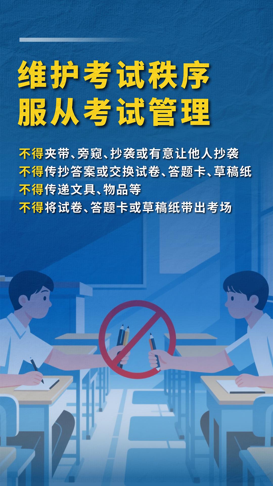 3.健康参加考试。考前及考试期间,做好健康防护;保持正常饮食和作息习惯,注意食品卫生和营养搭配;注意天气变化,调整心态,放松心情。考试当日,建议考生随身携带一件薄外衣,以避免不适应开启空调的室温。