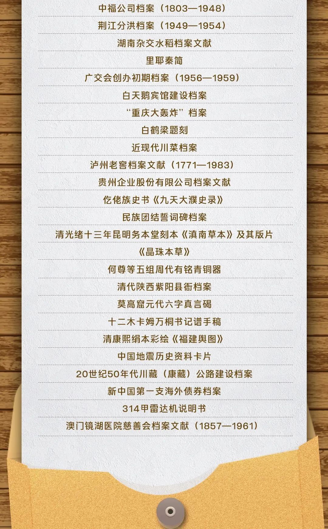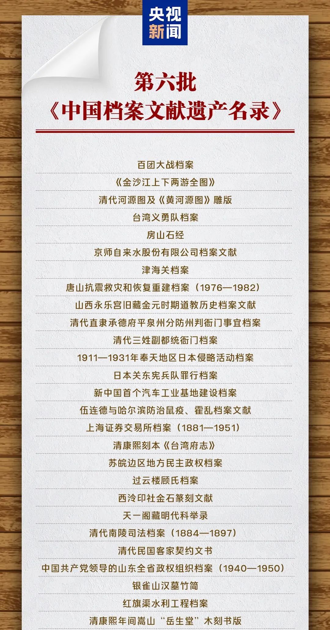 52项档案文献入选第六批《中国档案文献遗产名录》近日,国家档案局举办新闻发布会,发布了第六批《中国档案文献遗产名录》,52项档案文献入选。至此,经过六批评选,《中国档案文献遗产名录》入选项目达250项。详情>>
