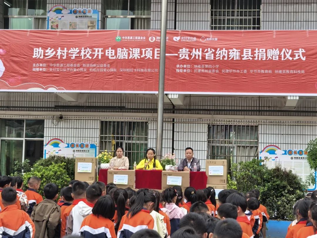 6月4日,由中华思源工程基金会新浪扬帆公益基金主办的“助乡村学校开电脑课项目”捐赠仪式在纳雍县第四小学举行,本次捐赠得到了支付宝公益爱心网友、蚂蚁庄园爱心网友及深圳帕拉卡科技有限公司大力支持。活动向当地纳雍县第四小学、第八小学、纳雍天河实验学校、纳雍天河第二实验学校及张家湾镇补作小学五所学校捐赠100台全新电脑及编程资源,为乡村学子架起科技桥梁。