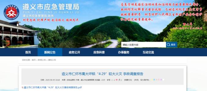 2025年4月29日22时52分许,贵州省遵义市仁怀市高大坪镇银水村一民房发生火灾,造成3人死亡。近日,遵义市应急管理局网站公布了《遵义市仁怀市高大坪镇“4·29”较大火灾事故调查报告》。