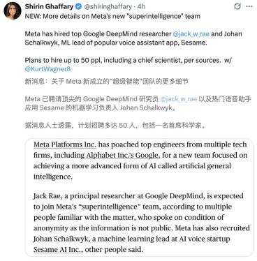 最近,Meta要组建「超级智能」新团队、重金挖角Alexandr Wang、全力冲击AGI的消息,闹得是沸沸扬扬。就在今天,Meta还被曝出提供了数千万美元的天价年薪,挖来了谷歌DeepMind首席研究员Jack Rae,同时还在招募AI语音初创公司Sesame AI的主管Johan Schalkwayk。