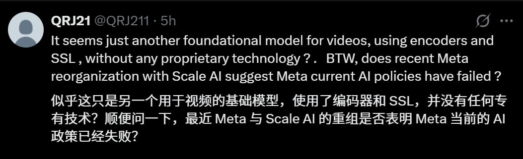 也有犀利的评论表示,V-JEPA似乎只是另一个用于视频的基础模型,没有专有技术?而且Meta跟Scale AI的重组,是否表明Meta当前的AI政策失败了?