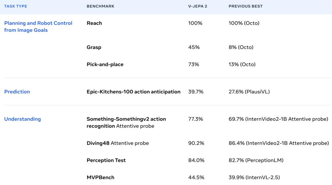 此次发布的V-JEPA 2,建立在去年发布的首个视频版V-JEPA基础上,进一步提升了动作预测和世界建模能力,使机器人能与陌生物体与环境互动并完成任务。