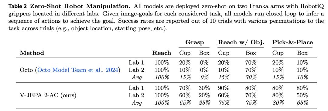 在全新环境中,V-JEPA 2拾取和放置新物体的成功率达到65%–80%。