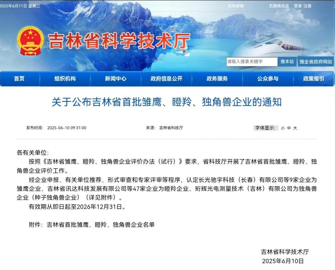 日前,吉林省科技厅公布了全省首批雏鹰、瞪羚、独角兽企业名单。其中,长光驰宇科技(长春)有限公司等9家企业为雏鹰企业、吉林省讯达科技发展有限公司、吉林省互联网传媒股份有限公司等47家企业为瞪羚企业、珩辉光电测量技术(吉林)有限公司为独角兽企业(种子独角兽企业)。
