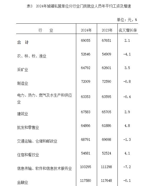 2024年全省城镇私营单位就业人员年平均工资69055元,比上年增加1404元,名义增长2.1%。扣除价格因素,2024年全省城镇私营单位就业人员年平均工资实际增长2.2%。