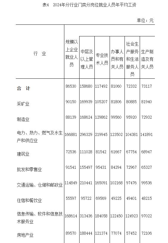 2024年全省规模以上企业就业人员年平均工资为86530元,比上年名义增长3.7%。其中,中层及以上管理人员158680元,增长2.2%;专业技术人员117492元,增长4.1%;办事人员和有关人员81060元,增长5.6%;社会生产服务和生活服务人员72332元,增长1.8%;生产制造及有关人员73117元,增长3.8%。