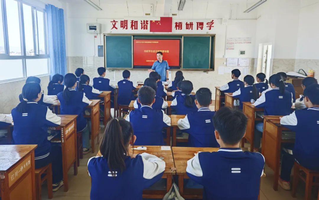 随后,王院长走访了宁海街道海浒中学,和校领导全方位了解了学校在教学、师资、学生管理等方面的情况。针对青少年道德与法治教育,王院长和代校长围绕学校实际情况探讨交流了见解与建议。王院长还为海浒中学的学生们讲授了一堂思政课,将习近平生态文明思想和习近平总书记考察云南时对生态保护的殷殷嘱托传达给同学们,号召同学们以实际行动守护家乡的星云湖,将守护绿水青山内化为自觉行动,做美丽江川、美丽星云湖的积极守护者。