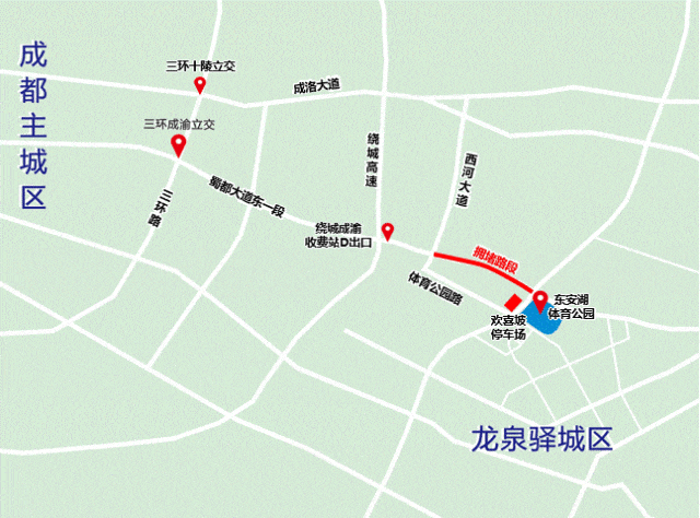 1、欢喜坡停车场:由成都方向自驾前往,遇蜀都大道出现拥堵时,建议经三环十陵立交→成洛大道→西河大道→体育公园路或经渝蓉高速龙泉驿收费站出站→汽车城大道抵达停车场。