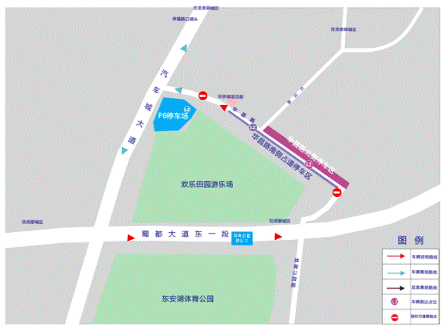 5、汽车城大道三段西侧辅道临时停车区:车头朝南,散场时车辆经汽车城大道东安湖下穿或蜀都大道东一段疏散。