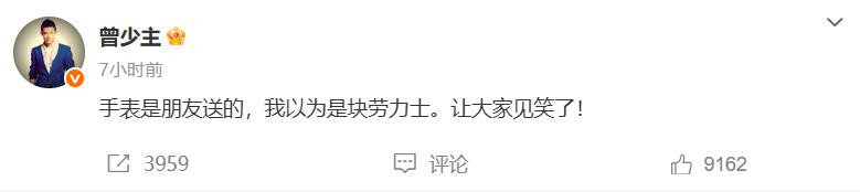13日下午,曾毅在社交平台回应此事:手表是朋友送的,我以为是块劳力士。让大家见笑了!