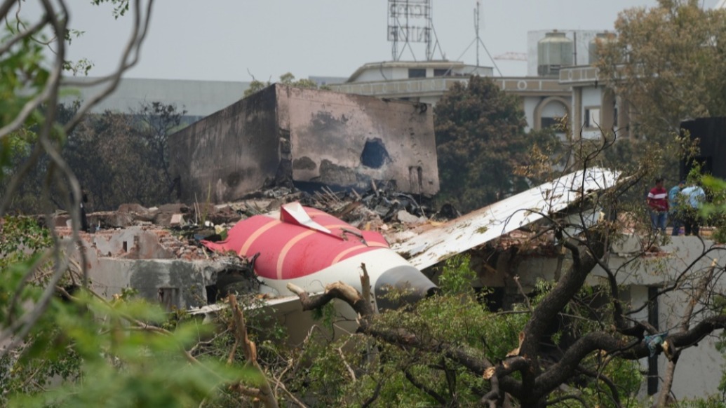 6月13日,在印度古吉拉特邦艾哈迈达巴德,几名男子站在客机残骸旁。新华社 图