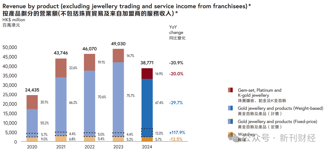 在黄金产品线持续扩张的同时,个性品牌业务却呈现战略性收缩,这一两极分化的发展态势直接导致珠宝类业务对集团的整体贡献度大幅萎缩。根据最新财报披露,在2020至2024财年(截至各年9月30日止六个月)期间,珠宝镶嵌、铂金及K金首饰业务的营收占比遭遇腰斩式下滑,从30.1%锐减至14.9%;同期钟表业务的份额也从9%收缩至5.7%。