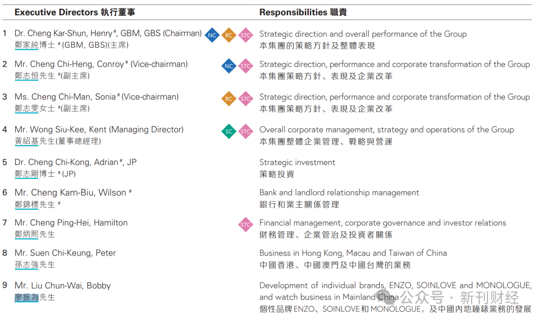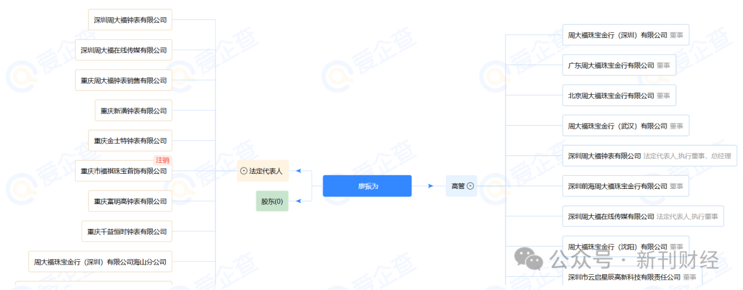 除执行董事职务外,廖振为还深度参与集团子公司管理。爱企查数据显示,其在14家企业担任法定代表人,49家企业出任高管,共计52个任职企业。这些职务多与其分管的钟表业务以及ENZO、SOINLOVE等个性品牌及直接相关。随着廖振为全面退出所有附属公司管理职位,这些业务板块将面临重大人事调整。
