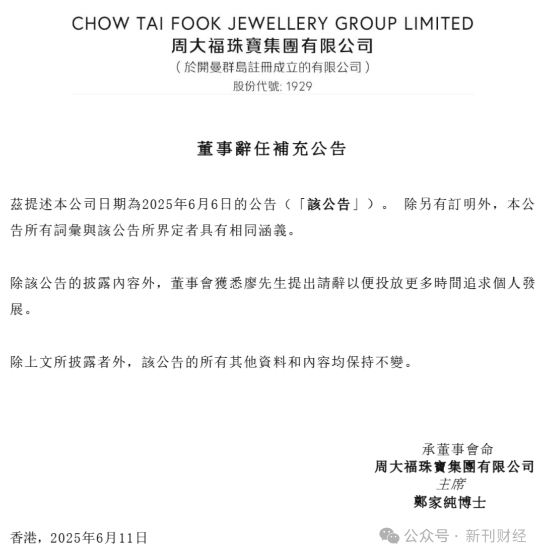 香港联交所上市公司周大福珠宝集团(股票代码:1929.HK)于6月11日发布补充公告,进一步披露执行董事廖振为的辞任详情,廖先生请辞是为了“投放更多时间追求个人发展”。