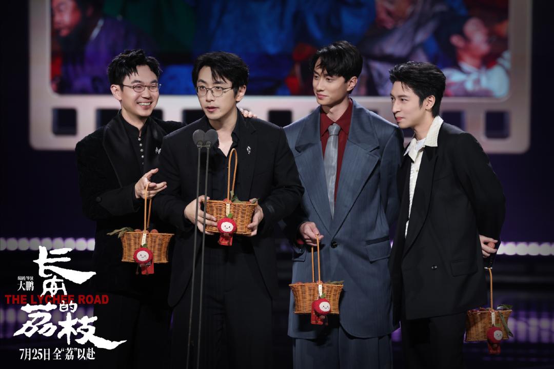 电影《长安的荔枝》在微博电影之夜活动中获得年度瞩目影片,编剧、导演兼领衔主演大鹏,领衔主演白客、刘俊谦,友情出演孙阳组成的“荔枝男团”提着荔枝果篮上台接受荣誉。