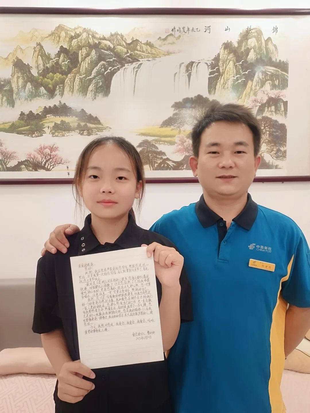 收到这份礼物时,我很感动,画作的每一处细节都诉说着涵涵对我无尽的爱和理解。作为揽投员,我按时揽投包裹邮件;而我的女儿,却把最珍贵的情感“准时投递”到了爸爸心里。我将永远珍藏!