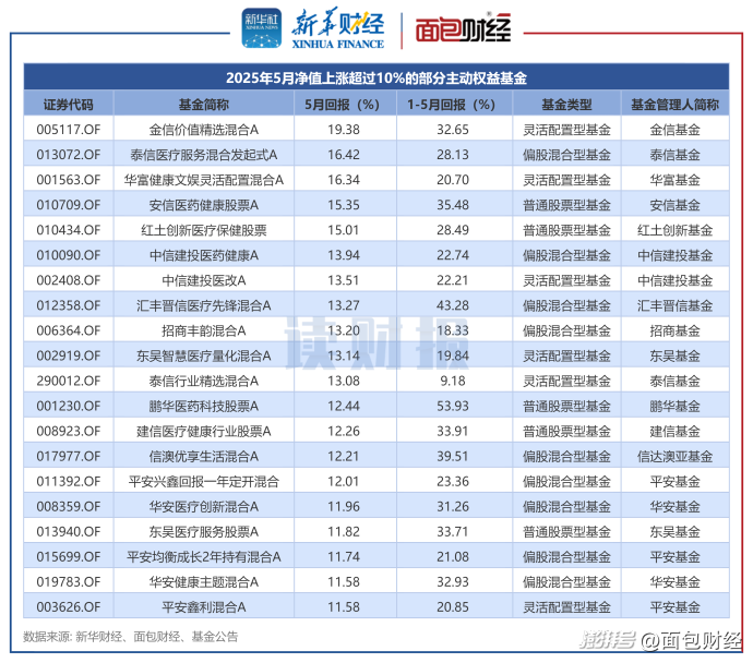 根据不完全统计,2025年5月,共有35只主动权益基金收益率超过10%,来自金信基金、泰信基金、华富基金等机构。
