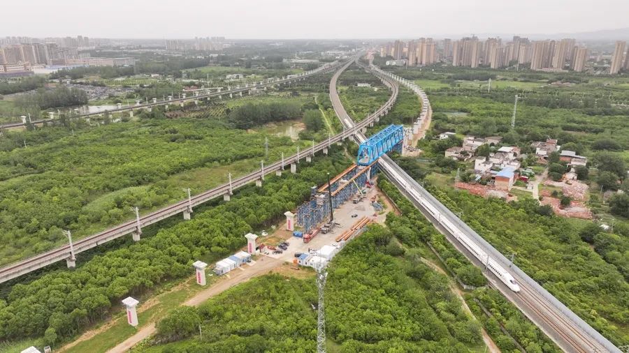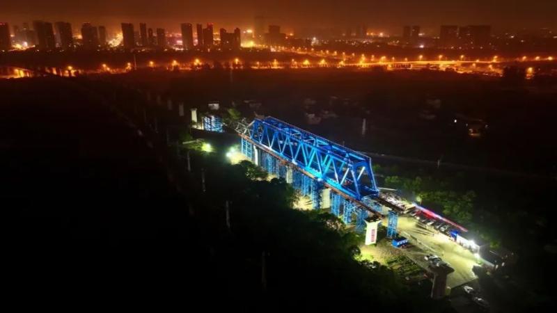 6月15日凌晨1时30分,在位于安徽省合肥市肥东县的新建上海至南京至合肥高速铁路(以下简称沪宁合高铁)施工现场,一榀重量近千吨的钢桁梁在导梁的牵引下,成功上跨沪蓉铁路滑移就位。这标志项目建设取得重要进展,为后续架梁施工奠定了坚实的基础。