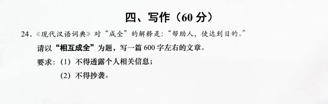 作文题鼓励考生运用语言表达自己真实而独特的感受,让不同经历和认知层次的考生都有事可写、有情可抒、有理可说。在“人人有话可写”的前提下,提供了广阔的思维空间,鼓励考生多元立意,写出自己的独特体验。考生可以讲述相互帮助、彼此成全的小故事,也可以多层次、多角度地表达对“相互成全”的理解与阐释。构思上可以是自我与他人(事、物)双线并进,协同推进,达成立意的逐层深化。