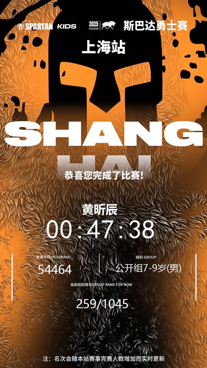 而公开组的小勇士则以体验和挑战自我为主,分为4-6岁(3.1公里、18个障碍)、7-9岁(4.1公里、22个障碍)和10-14岁(5.1公里、26个障碍),以黄昕辰小朋友为例,他在7-9岁年龄段中以47分38秒完赛,在该组别全部1045名参赛选手中排名第259名。