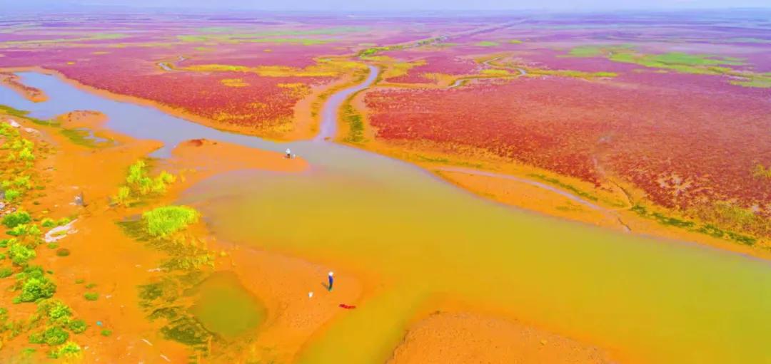 深秋时节,芦花在黄河边盛放,天地间一片雪白。盐地碱蓬如红地毯铺展,似火焰在绿野跃动,为黄河口染上绚烂色彩。