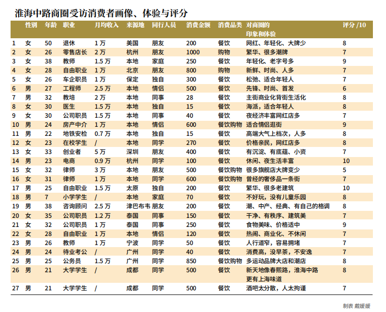 4月25日-5月19日,澎湃研究所研究员在淮海中路商圈的巴黎春天、淮海755、TX淮海、K11、新天地、 INS新乐园等地随机采访了27名消费者,梳理受访者基本情况后发现年轻消费者居多,上班族、游客比例均衡。