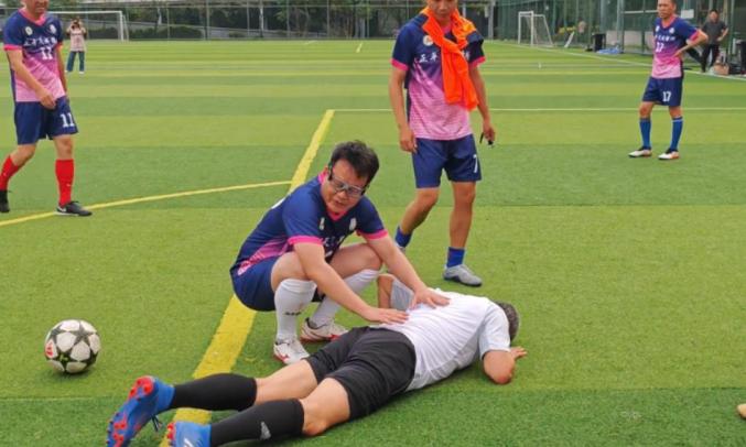 近日,央视主持白岩松踢球时不慎摔倒,躺在地上久久不起。