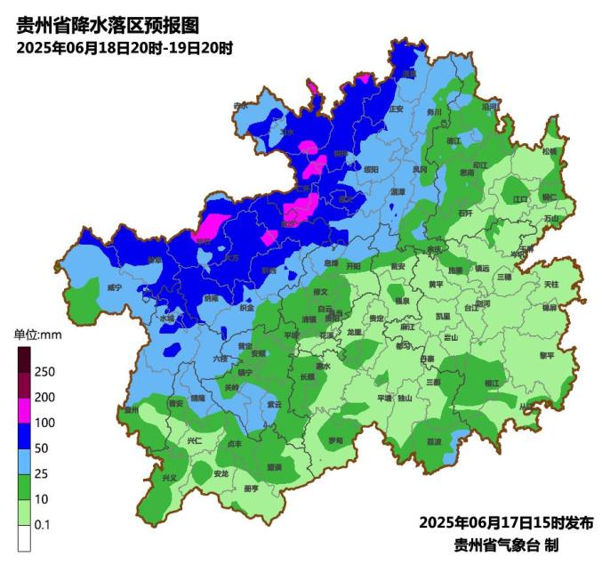 17日夜间到18日白天,省的西北部地区多云转阴天有阵雨或雷雨,毕节市、六盘水市北部、遵义市西部局地有中到大雨,部分乡镇暴雨,雷雨中局地伴有短时强降水、大风、冰雹等强对流天气,其余地区多云间阴天有阵雨或雷雨;
