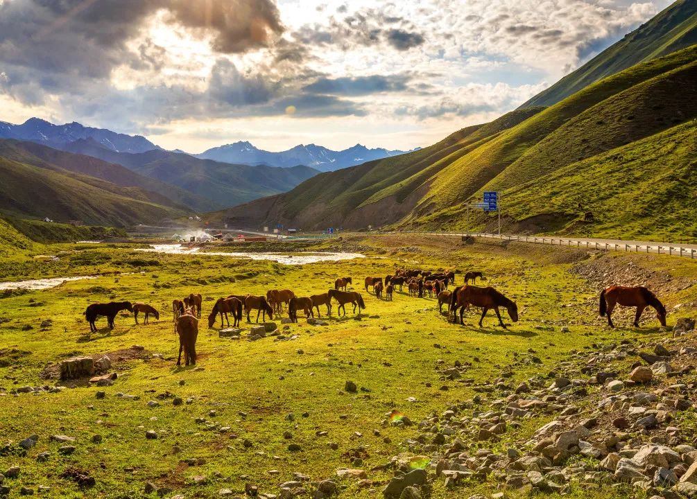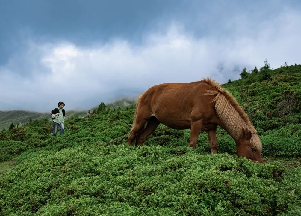 作品介绍:在山野间,骏马啃食青草,游客悠然踱步,彼此互不惊扰,这般和谐的画面,犹如仙境。