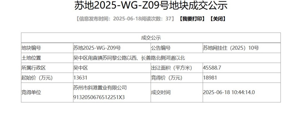 地块信息显示,苏地2025-WG-Z09号,位于吴中区甪直镇苏同黎公路以西、长善路北侧河道以北,地块出让面积45588.7平方米,总规划建筑面积104854.01平方米,起始价13631万元,折合起始楼面价约1300元/平方米,建筑限高80米。该地块经过83轮竞价后,由苏州市斜港置业有限公司以总价约1.9亿元竞得,成交楼面价约1810元/平方米,溢价率39.25%。