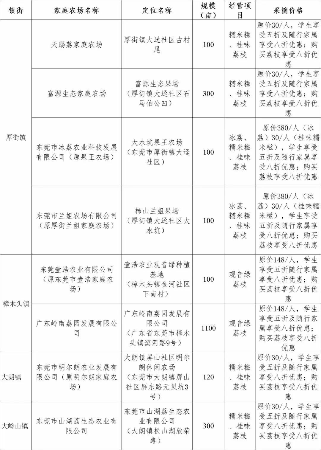 除高铁票价优惠外,东莞精心挑选了支持高铁票学生优惠的荔枝采摘点,首批共从厚街镇、樟木头镇、大朗镇、大岭山镇等镇街选择了一批农场、果园,可享受高考学子5折、随行家属8折采摘优惠,购买荔枝一律享受8折优惠。