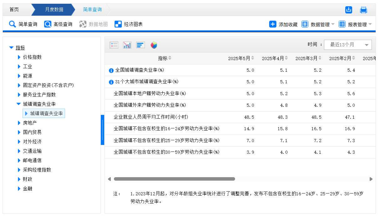 国家统计局发布5月份分年龄组失业率数据。5月份,全国城镇不包含在校生的16—24岁劳动力失业率为14.9%,全国城镇不包含在校生的25—29岁劳动力失业率为7.0%,全国城镇不包含在校生的30—59岁劳动力失业率为3.9%。(国家统计局网站)
