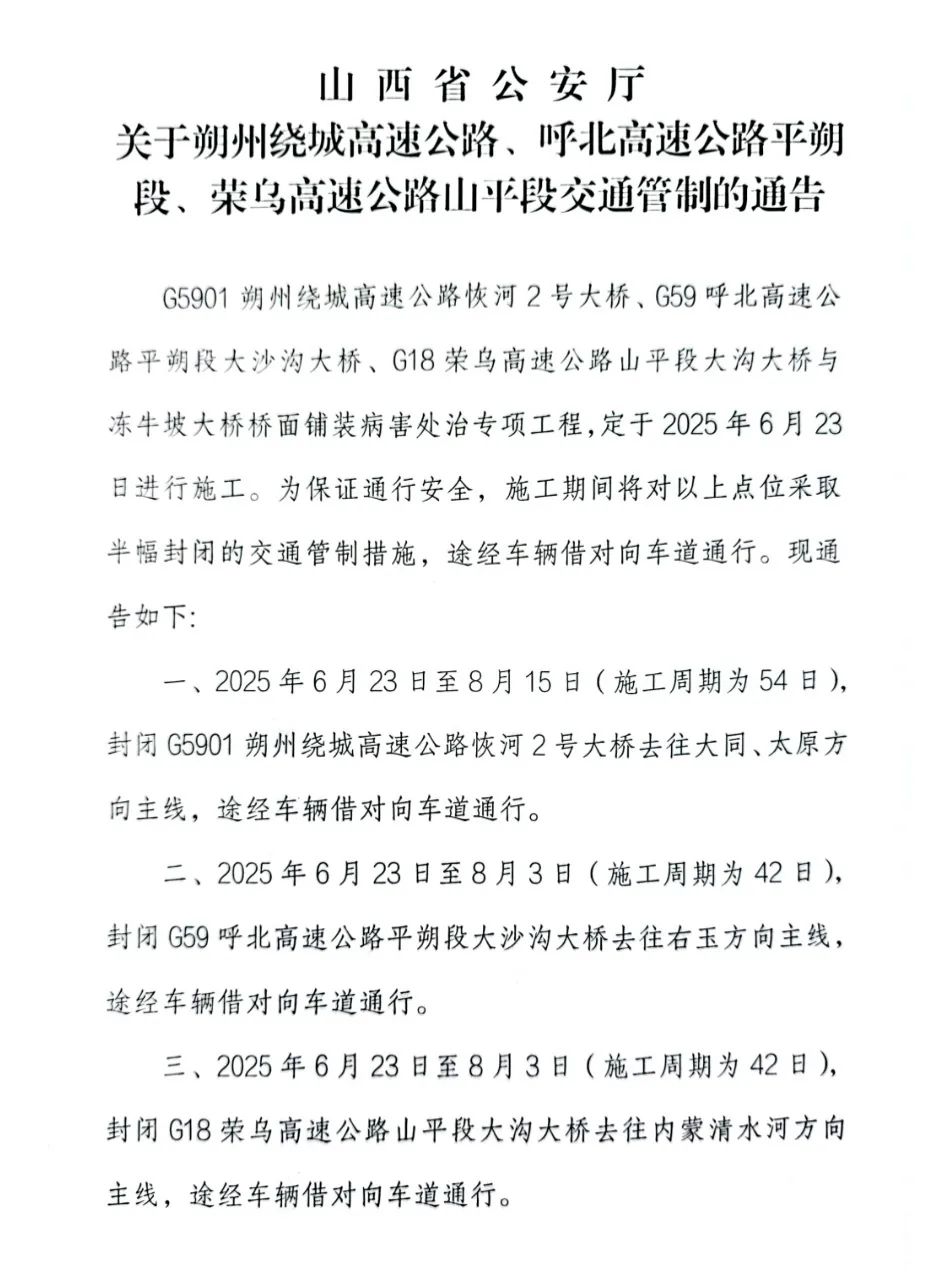 重要提醒 | 关于朔州绕城高速公路、呼北高速公路平朔段、荣乌高速公路山平段交通管制的通告