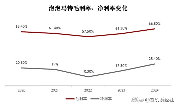 2024年,泡泡玛特整体毛利率达到66.8%,净利率25.4%,把其余的“消费三姐妹”甩在了身后(老铺黄金、蜜雪冰城、毛戈平2024年净利率分别为17.3%、17.9%、22.7%)。 即便在低谷期的2022年,公司毛利率也达到了57.5%,净利率10.3%。