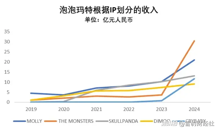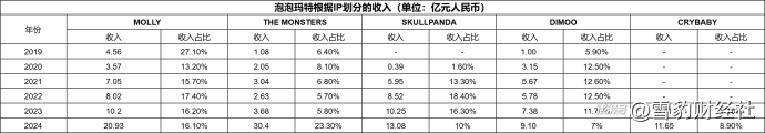从2019年到2023年,长达5年时间里,The Monsters的表现一直四平八稳,IP收入从1.08亿上升至3.68亿,收入占比最高也不过8.1%,不仅无法比肩MOLLY,还被同期推出的DIMOO赶超后越落越远,上升势头也远不及2020年推出的Skullpanda。