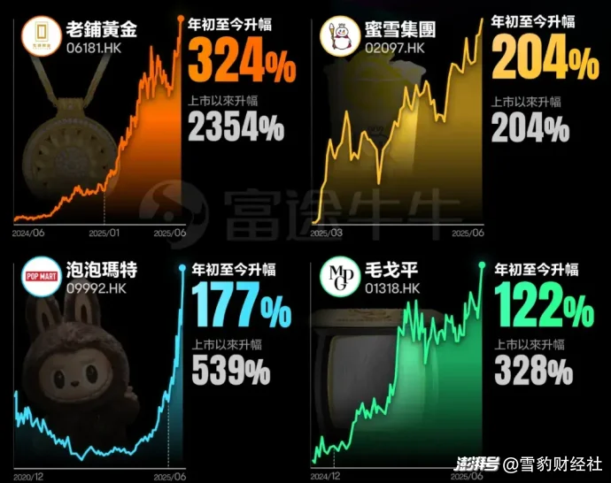 在资本市场,泡泡玛特这一天的股价再创新高,德意志银行直接把泡泡玛特目标价上调至303港元。连续大涨让泡泡玛特和蜜雪集团、老铺黄金、毛戈平组成了港股“消费四姐妹”,富时中国50指数成分股也在6月4日把泡泡玛特纳入其中。截至6月16日,泡泡玛特的市值已超3600亿港元。