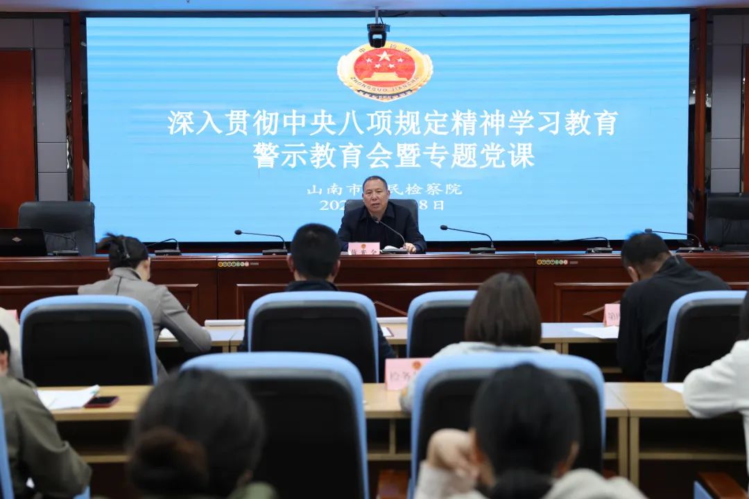 为深入贯彻落实中央八项规定精神,进一步加强检察队伍建设,提高干警廉洁自律意识,6月18日,山南市人民检察院召开深入贯彻中央八项规定精神学习教育警示教育会暨专题党课。院党组成员、副检察长蒋光全主持会议。