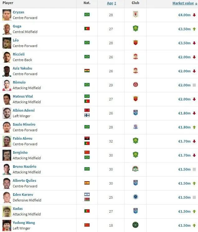 他和归化球员塞尔吉尼奥也是唯一进入中超前12名的中国球员,其他球员的具体身价情况如下: