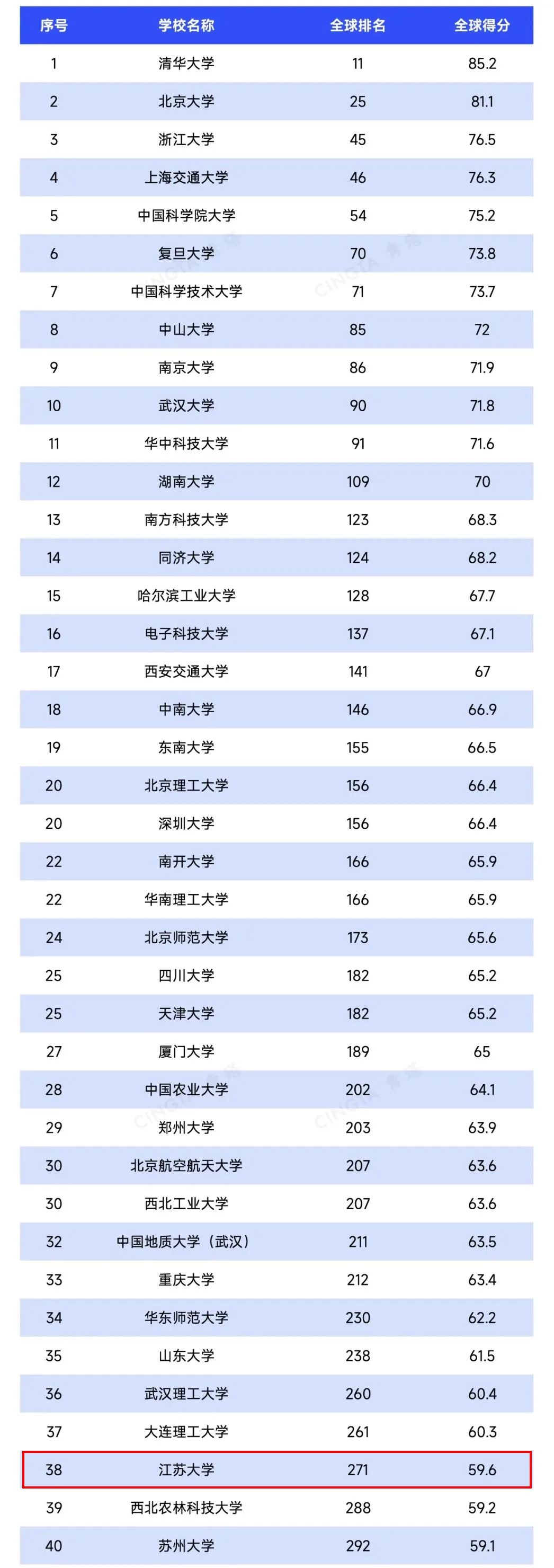 榜单显示,江苏大学位列全球高校第271位、亚洲高校第59位、中国内地高校第38位,在江苏省内高校排名第3,列省属高校首位。