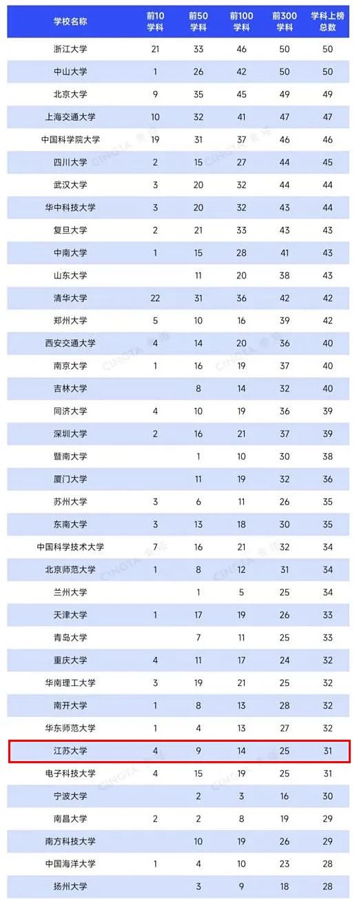 江苏大学共有31个学科上榜,上榜学科总数列内地高校第32位。其中,食品科学与技术列世界第3、绿色与可持续科学技术列世界第4、环境工程列世界第8、农业科学列世界第9,9个学科进入世界前50,14个学科进入世界前100。
