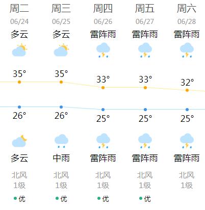 预计,未来三天副高控场,多云为主,局地容易有“开水”;6月26日后受南海热带系统影响,广州市雷雨多发,局部大雨或暴雨,高温略有缓解。